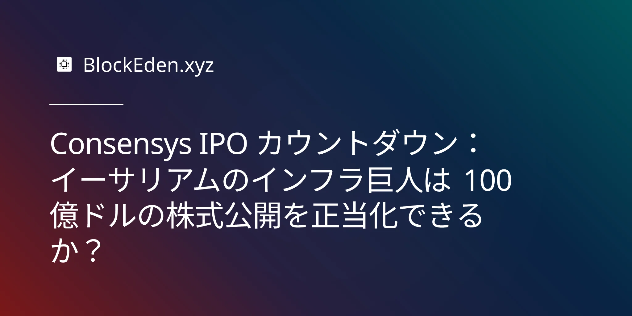 SEC が 2026 年 2 月に Consensys に対する訴訟を棄却したとき、それは単に法的決着を意味するだけではなく、2021 年の Coinbase の直接上場以来、最も重要な暗号資産の IPO となる可能性を秘めた扉を開きました。JPMorgan と Goldman Sachs が 2026 年半ばの公開に向けて助言を行い、セカンダリーマーケットではすでに同社の評価額が 100 億ドルを超えている中、問題は Consensys が上場するかどうかではありません。その Ethereum インフラ帝国が、公開市場でのリターンにつながるかどうかが問われています。