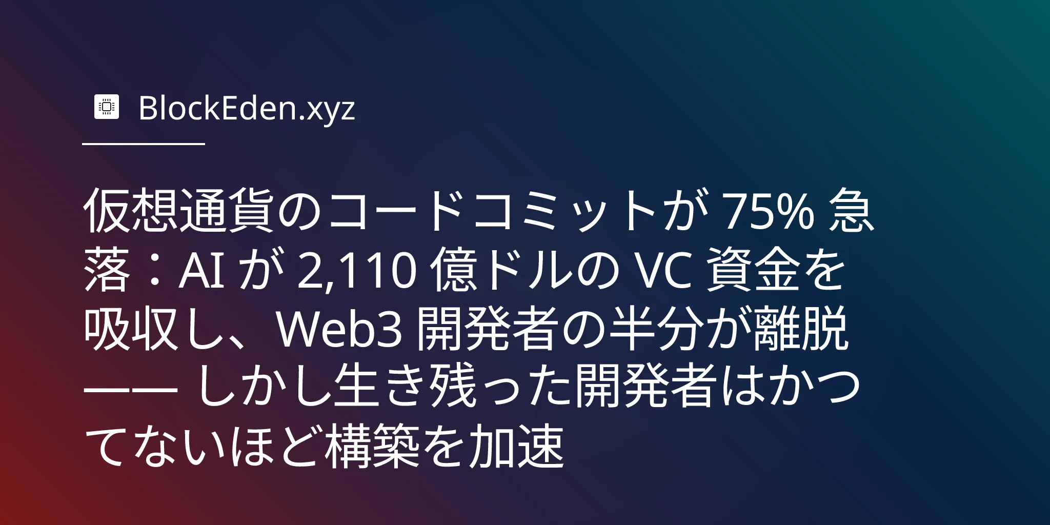 週次のオープンソース仮想通貨コミット数は 871,000 から 218,000 へと急落し、75% もの崩壊を見せました。アクティブなブロックチェーン開発者は 8,700 人から 4,600 人へと 47% 減少しました。一方で、AI へのベンチャー資金調達は 2025 年だけで 2,110 億ドルに達し、仮想通貨業界がかつて直面したことのないペースで人材を吸収しています。しかし、この惨状の中にはパラドックスが隠されています。残留した開発者はより経験豊富で生産性が高く、以前よりも迅速にプロダクトをリリースしているのです。