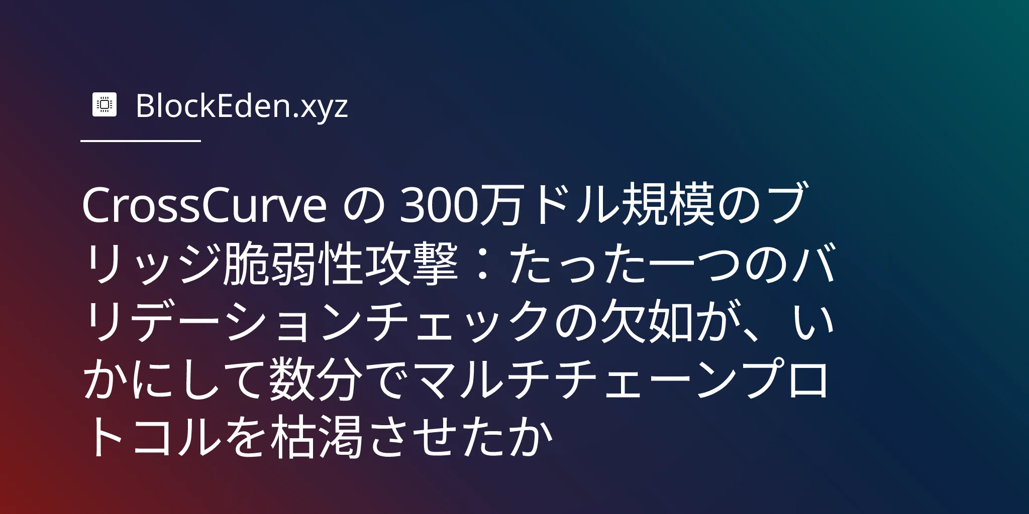 それは 1 時間もかかりませんでした。2026 年 1 月 31 日、攻撃者は CrossCurve のブリッジ・インフラストラクチャにおける単一のスマートコントラクト関数に、クリティカルな検証チェックが欠落していることを発見しました。そして、誰もが反応する前に、Ethereum、Arbitrum、およびその他のネットワーク全体で 300 万ドルを組織的に流出させました。巧妙なゼロデイ攻撃も、内部関係者のキーの漏洩もありません。ただ、偽造されたメッセージと、ブロックチェーン上の誰でも実行できる関数呼び出しがあっただけです。