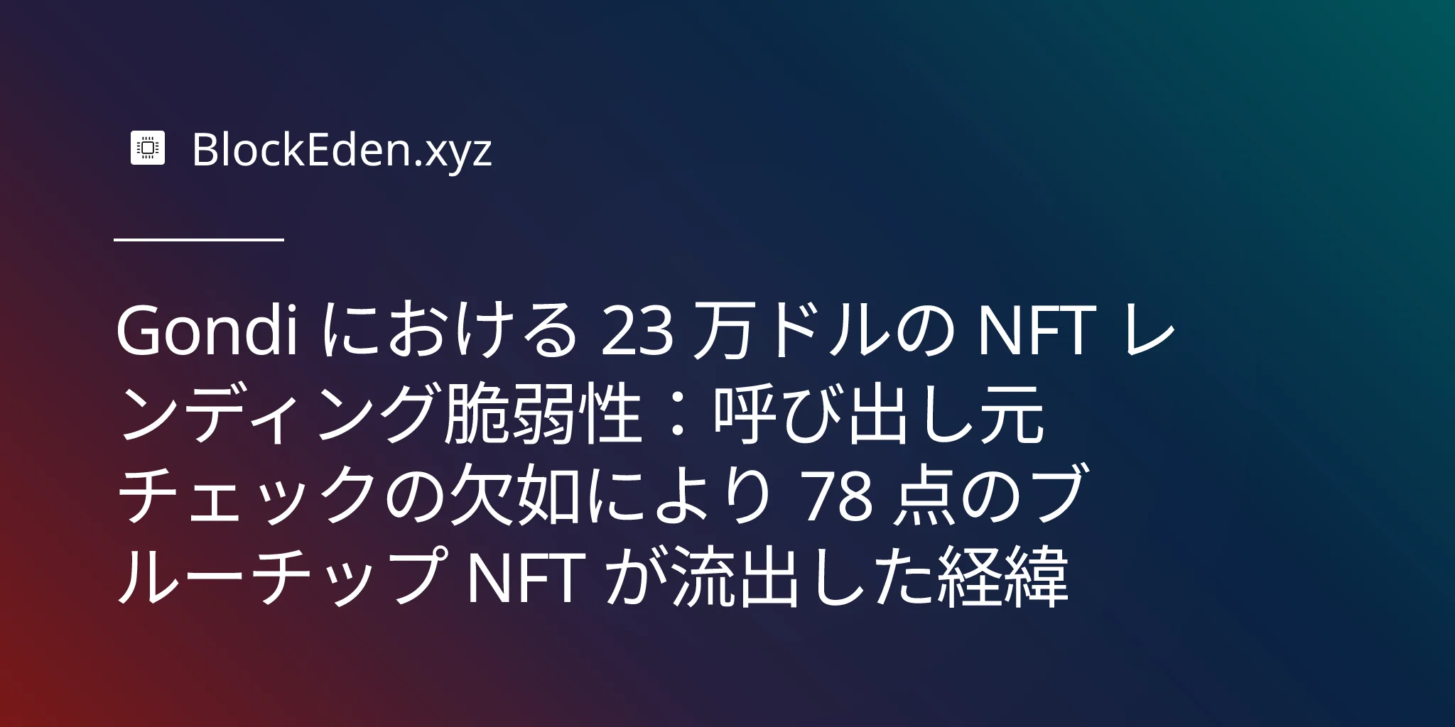 1 つの認可チェックの欠落。17 日間も気づかれず。78 個のブルーチップ NFT — Art Blocks、Doodles、Beeple の作品を含む — が、一度もトランザクションを開始していないウォレットから流出した。2026 年 3 月 9 日の Gondi エクスプロイトは、「便利な機能」がいかに攻撃対象(アタックサーフェス)になり得るか、そしてなぜ NFT レンディング・セクターが代替可能トークン(ファンジブル・トークン)の DeFi にはなかったセキュリティ上の課題に直面しているのかを示す典型的な事例である。