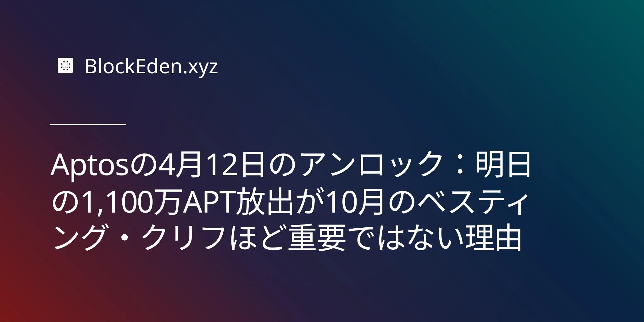 明日、2026年4月12日、Aptos は 1,131万 APT トークン — 現在の価格で約 965万ドル相当 — を流通供給量に放出します。Crypto Twitter は注目し、トークンアンロックトラッカーが点灯しています。しかし、Aptos にとって明日よりもはるかに重要な日付は、明日ではなく 6ヶ月後のことです。