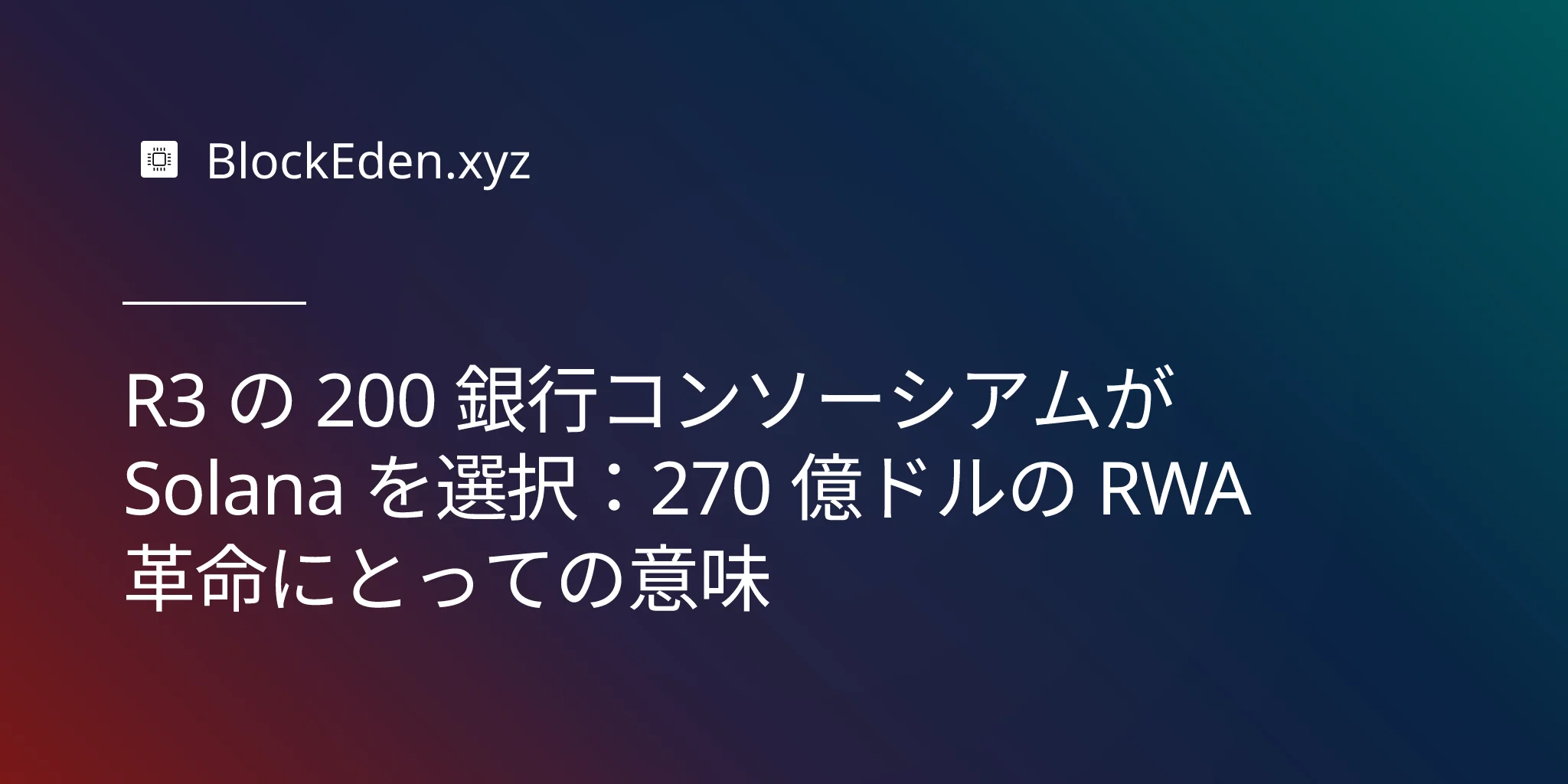 世界最大の規制対象金融機関のコンソーシアムが、パブリック・ブロックチェーンに旗を立てることを決定したとき、それは注目に値します。R3 — 200 以上のグローバル銀行において 170 億ドルを超えるトークン化された現実資産(RWA)を支える Corda ネットワークを運営するエンタープライズ・ブロックチェーン企業 — は、決定的な賭けに出ました。それは、機関投資家向け金融の未来は Solana 上で動くということです。